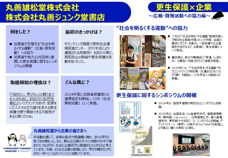 法務省は、民間ボランティアや企業の方々のご協力をいただきながら、更生保護に対するすべての国民の理解を広げるため、情報発信や啓発活動に取り組んでいます。