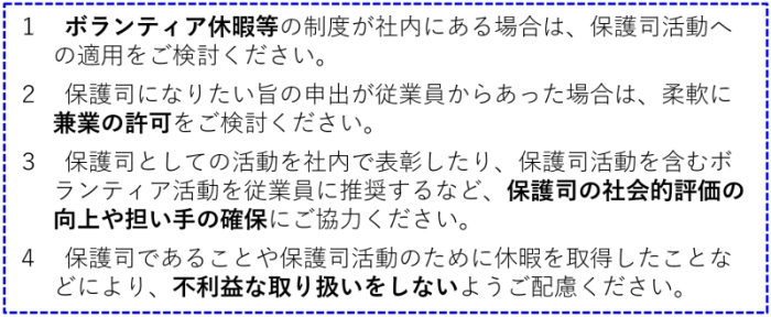 現役世代の方々が働きながら安心して保護司活動に参画できるよう、企業の皆様には、事業活動に支障のない範囲で、例えば、以下についてご配慮をお願いします。