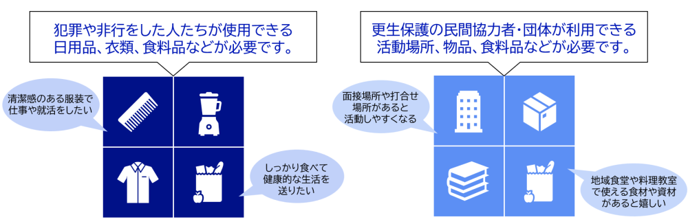 再犯防止に取り組む民間協力者・団体(更生保護施設など)に、皆様が製造・販売する既存の製品やサービス等を提供いただくことか゛、犯罪や非行をした人たちの日常生活や、民間協力者・団体の活動を支える糧になります。