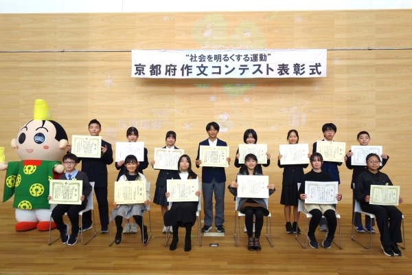 京都府推進委員会委員長(京都府知事)賞6名(小学生、中学生各3名)、京都府教育委員会教育長賞2名(小学生、中学生各1名)、京都市教育長賞2名(小学生、中学生各1名)、京都新聞賞2名(小学生、中学生各1名)、KBS京都賞2名(小学生、中学生各1名)、浄土真宗本願寺派更生保護事業協会会長賞2名(小学生、中学生各1名)、京都保護観察所長賞2名(小学生、中学生各1名)の合計18名が表彰されました。