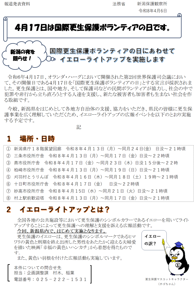 4月17日国際更生保護ボランティアの日等に、より多くの方に更生保護事業を理解していただくため、新潟県庁及び新潟県内の各公共施設等において更生保護のシンボルカラーである黄色にライトアップする広報イベントを行います。