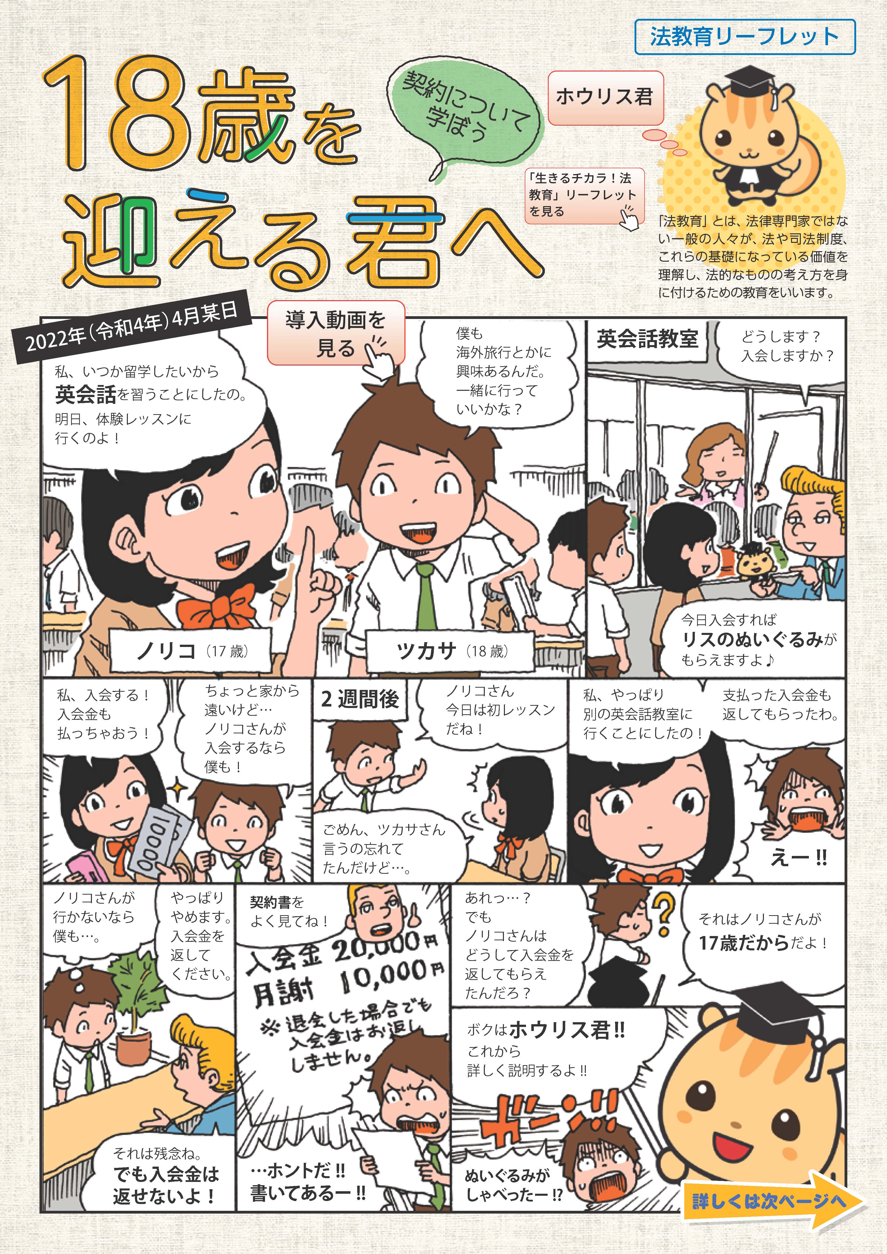 そこで、当省では、成年に達する年齢を間近に控えた高校生を対象とし、契約を題材として、私法の基本的な考え方を伝えるとともに、権利・義務の主体として能動的に行動することの意義や法的なものの考え方を学ぶためのリーフレットを作成しました。