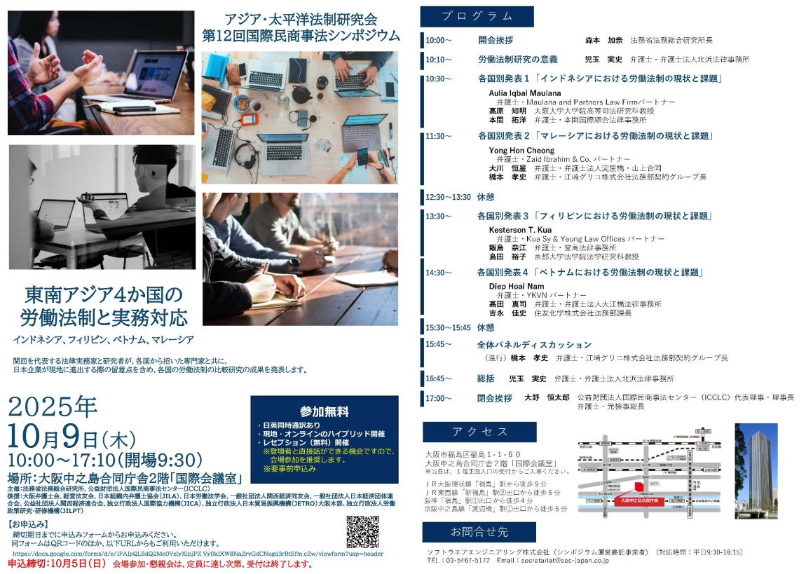 後援:大阪弁護士会、経営法友会、日本組織内弁護士協会(JILA)、日本労働法学会、一般社団法人関西経済同友会、一般社団法人日本経済団体連合会、公益社団法人関西経済連合会、独立行政法人国際協力機構(JICA)、独立行政法人日本貿易振興機構(ジェトロ)大阪本部、独立行政法人労働政策研究・研修機構(JILPT)