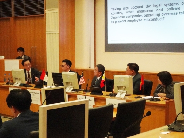 全体パネルディスカッションの様子。進行は、アジア・太平洋法制研究会の橋本孝史委員(弁護士・江崎グリコ株式会社法務部契約グループ長)。パネリストは、インドネシアのAulia Iqbal Maulana弁護士(Maulana and Partners Law Firm)、マレーシアのYong Hon Cheong弁護士(Zaid Ibrahim & Co.)、フィリピンのKesterson T. Kua弁護士(Kua Sy & Yeung Law Offices)及びベトナムのDiep Hoai Nam弁護士(YKVN)