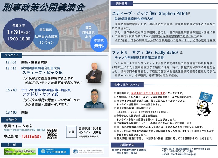 当研修所は、日本刑事政策研究会及びアジア刑政財団との共催により、公開講演会を以下のとおり開催します。