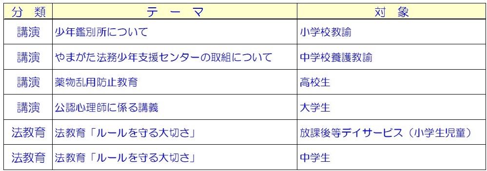 近年は、以下の例のとおり、講師派遣等を実施しております(下表参照)。