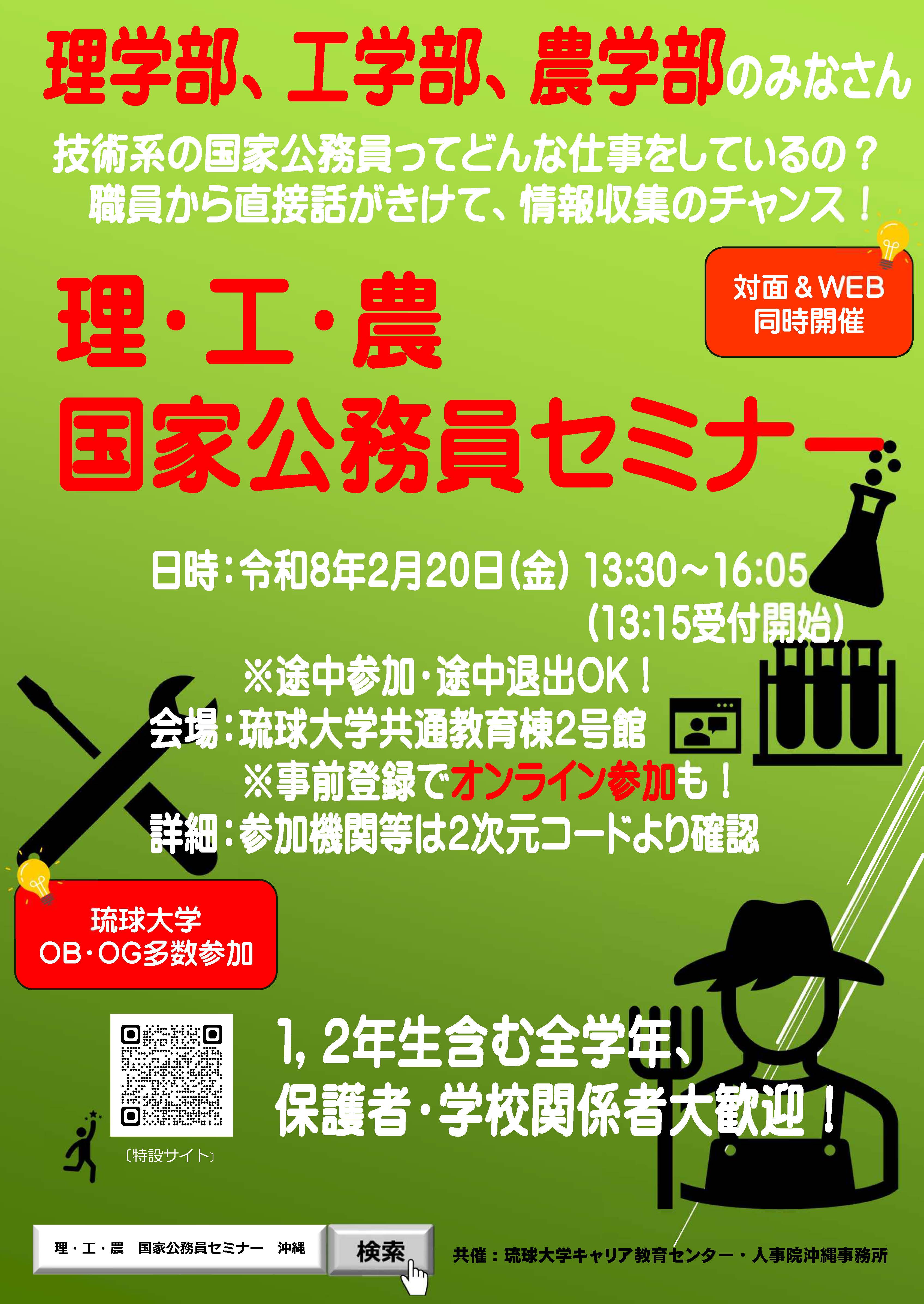那覇公安調査事務所は、琉球大学で開催される「2025年度 理・工・農 国家公務員セミナー」(人事院主催)に参加します(オンラインでも実施)。業務説明に加え、質疑応答の時間もありますので、どうぞ気軽に御参加ください。