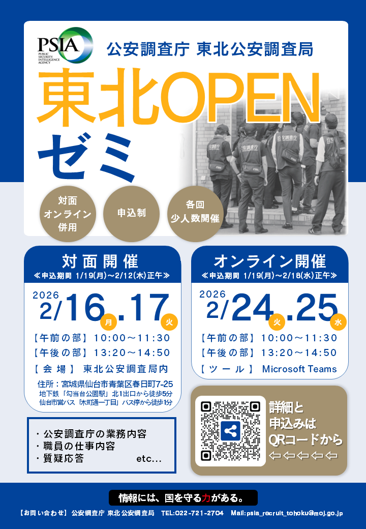 【東北公安調査局】(対面2/16,17:オンライン2/24,25)業務説明会開催のお知らせ【東北OPENゼミ】